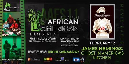 Join us Thursday, February 12, 2026, for James Hemings: Ghost in America’s Kitchen, the final film in Communities First, Inc.’s 11th Annual African American Film Series. This captivating documentary follows a curious chef uncovering the untold story of James Hemings, America’s first classically trained chef and the enslaved property of Thomas Jefferson. Discover how Hemings’ culinary genius helped shape American cuisine while exploring the complex legacy of freedom and creativity. The event takes place at the Flint Institute of Arts, 1120 E. Kearsley St., Flint, MI 48503, with dinner and live music beginning at 5:30 PM, the film at 6:45 PM, and a discussion panel to follow. Admission is free, with a suggested $5 donation. Register at https://tinyurl.com/AAFS2025.