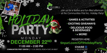 Join Communities First, Inc. for a free, family-friendly Holiday Party on Monday, December 22, from 11 a.m.–2 p.m. at the CFI Center, 1110 W. Bristol Rd., Flint. Enjoy music, crafts, family photos, games, giveaways, food and beverages, and a possible visit from Santa and Mrs. Claus. All ages are welcome to come celebrate the season and make memories together.